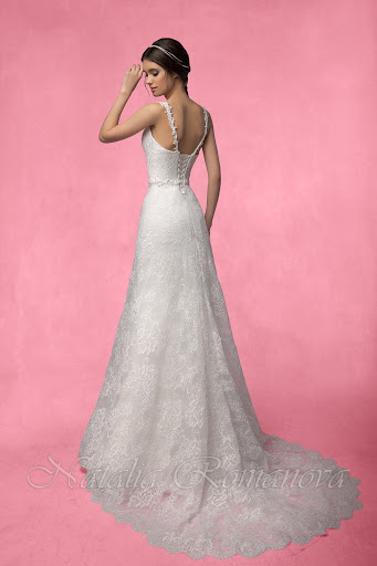 Юбка с небольшим расклешением переходит в деликатный шлейф