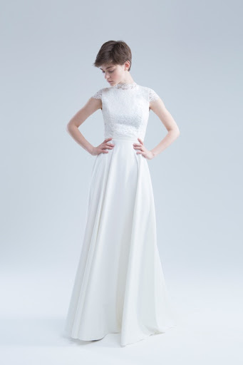 Безкорсетное платье с кружевным лифом и атласной юбкой. По спинке изящный треугольный вырез с рядом пуговиц по стойке элегантного воротника.